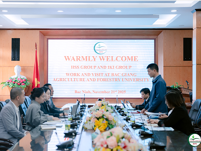 Sáng 21/11/2025, tại phòng họp số 2, Trường Đại học Nông - Lâm Bắc Giang đã đón tiếp và làm việc với Tập đoàn HSS (Nhật Bản) và Tập đoàn IKI GROUP nhằm trao đổi các chương trình hợp tác trong đào tạo, nghiên cứu và phát triển nông nghiệp công nghệ cao. TS. Nguyễn Tuấn Dương - Phó Hiệu trưởng Nhà trường chủ trì buổi làm việc.