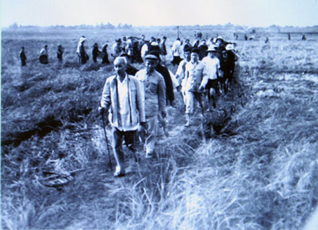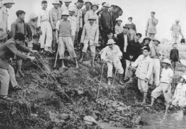 Bác Hồ tát nước chống hạn với bà con nông dân ở cánh đồng Quang Tó, xã Đại Thanh, huyện Thanh Trì, Hà Nội (12/01/1958).