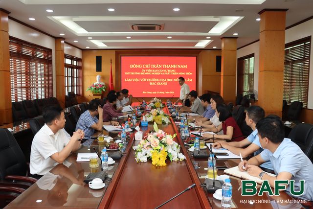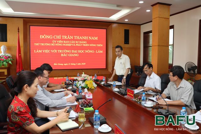 Sáng 21/5/2020, Thứ trưởng Bộ Nông nghiệp và Phát triển nông thôn Trần Thanh Nam cùng Đoàn công tác đã về thăm và làm việc tại Trường Đại học Nông – Lâm Bắc Giang. Tiếp và làm việc cùng với Đoàn công tác, về phía Trường có PGS.TS Nguyễn Quang Hà – Bí thư Đảng ủy, Hiệu trưởng Nhà trường; TS. Nguyễn Bình Nhự – Phó Bí thư Đảng ủy, Chủ tịch Hội đồng trường; Các đồng chí trong Ban Giám hiệu và trưởng các đơn vị trực thuộc.