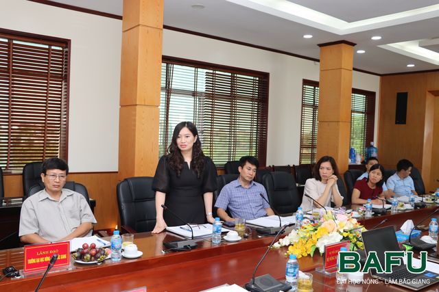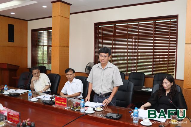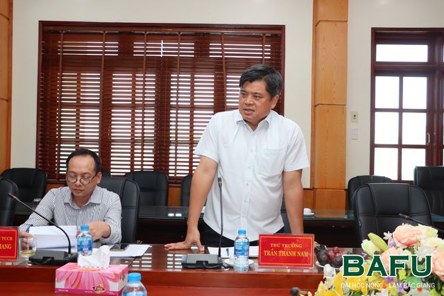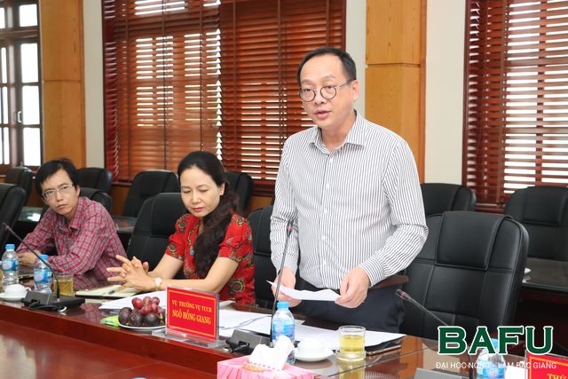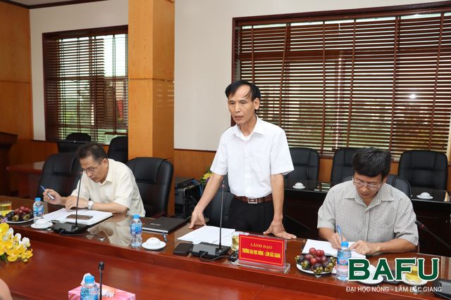 PGS.TS. Nguyễn Quang Hà – Bí thư Đảng ủy, Hiệu trưởng Nhà trường báo cáo tóm tắt tình hình hoạt động của Nhà trường Tại buổi làm việc, PGS.TS. Nguyễn Quang Hà – Bí thư Đảng ủy, Hiệu trưởng Nhà trường vui mừng chào đón Thứ trưởng Trần Thanh Nam và đoàn công tác của Bộ về thăm và làm việc tại Trường. Thay mặt Nhà trường, PGS.TS. Nguyễn Quang Hà báo cáo với Thứ trưởng về tình hình thực hiện nhiệm vụ của Trường Đại học Nông – Lâm Bắc Giang trong những năm gần đây. Trong báo cáo chỉ rõ, Nhà trường đã và đang từng bước đa dạng hóa các loại hình đào tạo, từ bậc trung học phổ thông đến sau đại học. Hoạt động nghiên cứu khoa học và hợp tác quốc tế có nhiều tiến bộ đáng kể, điển hình như việc trồng khảo nghiệm và chuyển giao thành công các giống Nho Hạ đen, Dưa lưới cho các địa phương ở phía Bắc… Bên cạnh những nâng cấp về cơ sở vật chất, trình độ giảng viên không ngừng được nâng cao thì vẫn còn tồn tại về tuyển sinh chưa đạt được chỉ tiêu đề ra. PGS.TS. Nguyễn Quang Hà cho biết, Nhà trường đang triển khai các nhiệm vụ chính trị quan trọng để tiến tới Đại hội Đảng bộ Trường Đại học Nông – Lâm Bắc Giang khóa III, nhiệm kỳ 2020-2025 và xin ý kiến Thứ trưởng trong việc chuẩn bị nhân sự bầu Hội đồng trường khóa II; Kế hoạch chuyển đổi sang cơ chế hoạt động mới của Nhà trường; Việc tổ chức các loại hình liên kết đào tạo với các trường đại học và cao đẳng trên cả nước và thực hiện các đề tài, dự án, các lớp tập huấn…