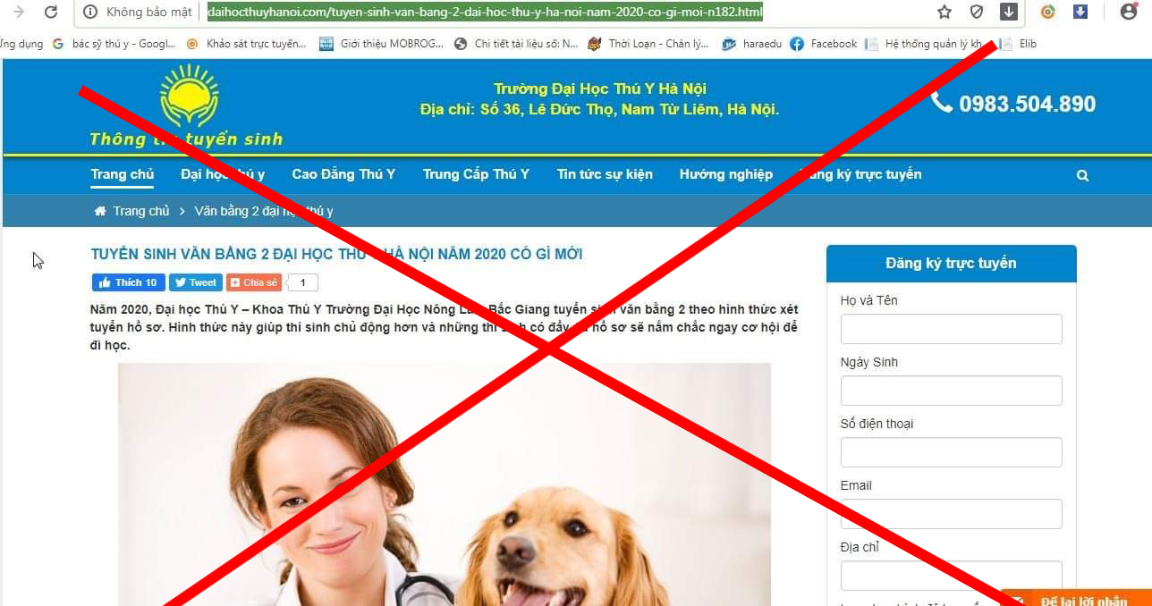 Thời gian qua trên Website có địa chỉ http://www.daihocthuyhanoi.com và một số trang mạng xã hội như: Facebook, Zalo có đăng tải thông tin tuyển sinh trình độ đại học ngành Thú y (hình thức đào tạo chính quy) trong đó có giới thiệu về Trường Đại học Nông - Lâm Bắc Giang là cơ sở đào tạo, cấp bằng; địa điểm tổ chức đào tạo là tại Hà Nội. Trường Đại học Nông - Lâm Bắc Giang là cơ sở giáo dục đại học công lập trực thuộc Bộ Nông nghiệp và Phát triển nông thôn, có trụ sở tại Thị trấn Bích Động, Việt Yên, Bắc Giang. Về vấn đề này, chúng tôi xin được chính thức thông báo để các bạn thí sinh và những người quan tâm được biết: các thông tin được đăng tải nói trên liên quan đến Đại học Nông Lâm Bắc Giang là hoàn toàn không đúng sự thật, rất có thể nhằm mục đích lừa đảo để trục lợi. Các bậc phụ huynh và các bạn thí sinh cần hết sức cảnh giác, kiểm tra thông tin khi quyết định nộp hồ sơ đăng ký tuyển sinh để tránh những hệ lụy đáng tiếc. Các thông tin tuyển sinh các ngành, các hệ đào tạo của Đại học Nông - Lâm Bắc Giang được công bố trên website chính thức của nhà trường có địa chỉ http://www.bafu.edu.vn và các kênh chính thống, có văn bản chính thức (đóng dấu và chữ ký của người có thẩm quyền). Ngoài ra, thông tin tuyển sinh của nhà trường luôn được cung cấp, tư vấn trực tiếp qua số điện thoại bàn 02043.874.387 và số điện thoại đường dây nóng 0977.613.688 đối với các thí sinh quan tâm.