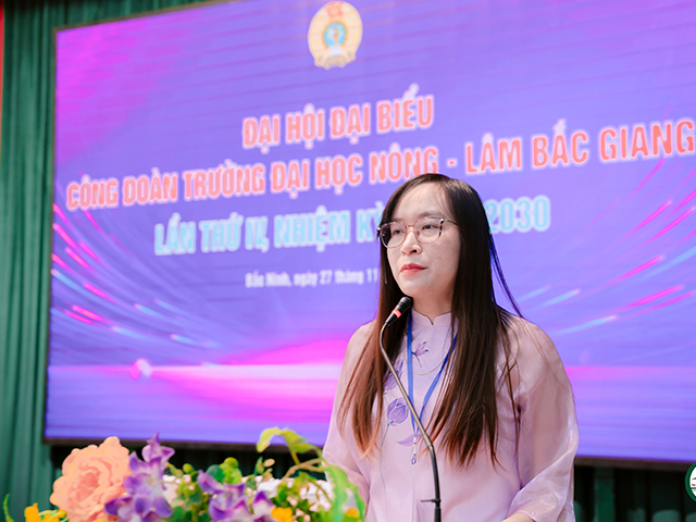 Đồng chí Phan Thị Huệ - Phó Chủ tịch Công đoàn Nông nghiệp và Môi trường Việt Nam phát biểu và tặng hoa chúc mừng Phát biểu chỉ đạo tại đại hội, đồng chí Phan Thị Huệ đề nghị Công đoàn Trường tiếp tục nâng cao chất lượng đời sống và năng lực chuyên môn của cán bộ, đoàn viên, đồng thời tăng cường công tác tuyên truyền, giáo dục để tạo sức lan tỏa cho các phong trào thi đua trong toàn trường. Đồng chí nhấn mạnh: “Sự ổn định chính là khả năng thích nghi; chỉ thích nghi được mới có thể thay đổi và phát triển.” Với tinh thần này, đồng chí tin tưởng rằng Ban Chấp hành khóa mới sẽ tiếp tục dẫn dắt Công đoàn Trường Đại học Nông - Lâm Bắc Giang giữ vững vị trí tiên phong trong khối các trường cao đẳng và đại học của Bộ, đồng thời góp phần xây dựng môi trường làm việc nhân văn, hiệu quả và bền vững.