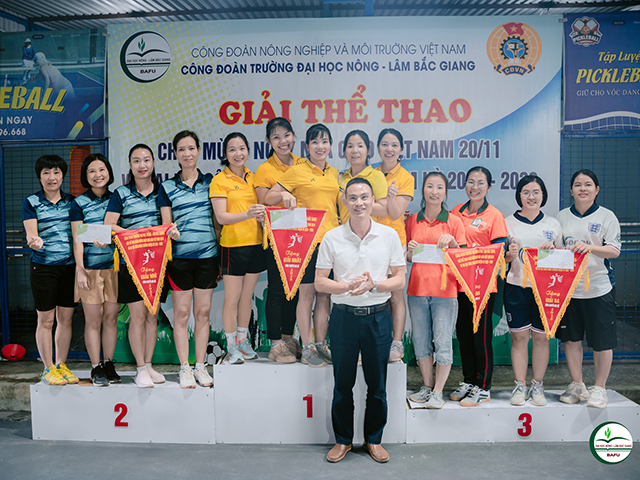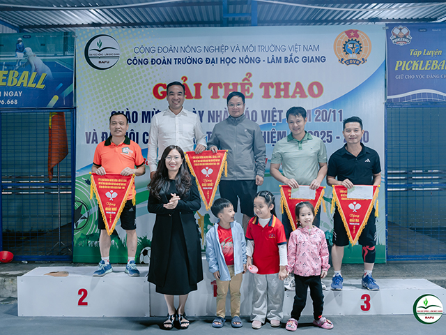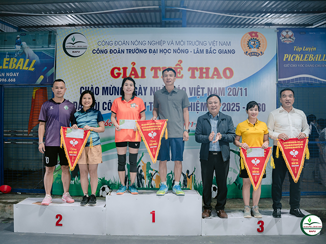 Chiều ngày 28/11/2025, Công đoàn Trường Đại học Nông - Lâm Bắc Giang tổ chức Lễ bế mạc và trao giải Giải thể thao chào mừng Ngày Nhà giáo Việt Nam 20/11 và Đại hội Công đoàn Trường nhiệm kỳ 2025-2030. Tham dự có PGS.TS. Mai Thị Huyền - Phó Bí thư Đảng ủy, Phó Hiệu trưởng Nhà trường cùng đông đảo các vận động viên. Sau một tuần thi đấu, giải thể thao đã diễn ra sôi nổi với nhiều trận tranh tài ở các nội dung khác nhau. Năm nay, Công đoàn Trường THPT Thân Nhân Trung tiếp tục khẳng định phong độ vượt trội khi xuất sắc giành giải Nhất ở nhiều nội dung như bóng chuyền hơi nam nữ, chạy tiếp sức, kéo co và Pickleball đôi nam nữ. Ở nội dung bóng chuyền hơi nữ, liên quân Công đoàn Khoa Kinh tế - Tài chính, Phòng Quản trị Đầu tư và Phòng Tài chính - Kế toán đã tạo nên bất ngờ lớn. Với lối chơi khoa học, tinh thần thi đấu kiên cường và sự phối hợp ăn ý, các vận động viên nữ đã vượt qua nhiều đối thủ mạnh để giành chức vô địch đầy thuyết phục. Tại nội dung Pickleball đôi nam, đội Trung tâm Ngoại ngữ -Tin học tiếp tục thể hiện sự ổn định khi cặp vận động viên Thành - Kiên thi đấu tự tin, bản lĩnh và đầy tập trung. Với những pha bóng chuẩn xác và chiến thuật hợp lý, đôi vận động viên đã xuất sắc giành giải Nhất. Không chỉ có các vận động viên thi đấu xuất sắc trên sân, lực lượng cổ động viên đến từ các đơn vị cũng góp phần quan trọng tạo nên thành công của giải. Những tiếng cổ vũ, reo hò, vỗ tay không ngớt, cùng sự chuẩn bị chu đáo từ nước uống, đồ ăn nhẹ cho các đội thi đã tiếp thêm sức mạnh tinh thần cho các vận động viên. Đặc biệt, các công đoàn bộ phận như Trung tâm Ngoại ngữ, Tin học, Phòng Đào tạo, hay Khoa Kinh tế - Tài chính... luôn xuất hiện với lực lượng cổ vũ đông đảo, nhiệt huyết, giúp không khí thi đấu càng thêm sôi động và giàu cảm hứng. Đồng chí Phạm Văn Vân - Trưởng Ban Tổ chức giải thể thao cho biết: Với gần 200 vận động viên tham dự, giải thể thao năm nay được tổ chức chuyên nghiệp, bài bản, tạo sức lan tỏa mạnh mẽ trong cán bộ, viên chức. Hoạt động góp phần nâng cao sức khỏe, đời sống tinh thần và tăng cường sự gắn kết giữa các đơn vị trong Nhà trường. + Một số hình ảnh tại Lễ trao giải thể thao: