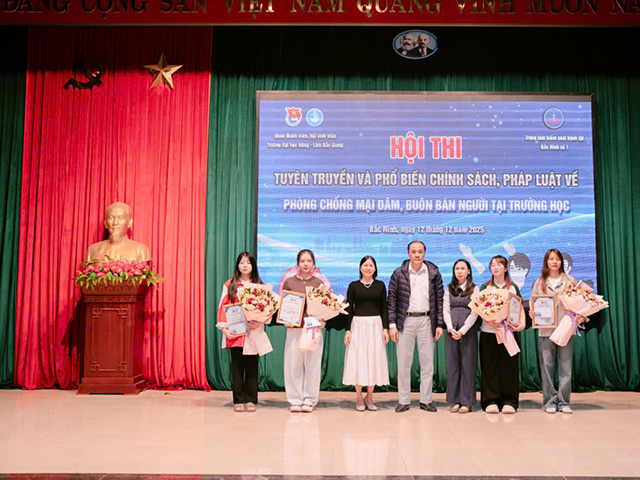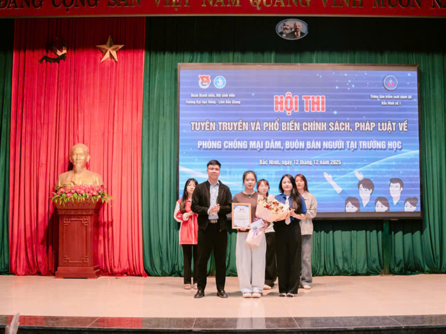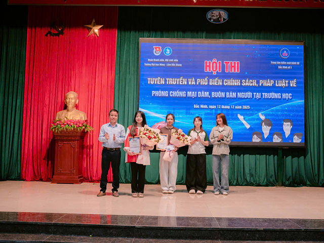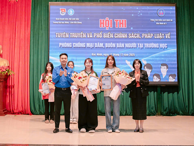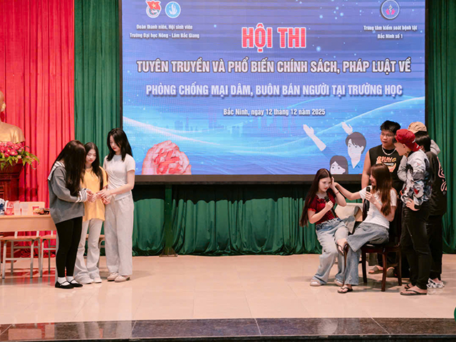 Chiều ngày 12/12/2025, Trường Đại học Nông - Lâm Bắc Giang đã tổ chức thành công “Hội thi tìm hiểu và phổ biến chính sách pháp luật về phòng chống tệ nạn mại dâm, mua bán người năm 2025”. Tham dự Hội thi có lãnh đạo Trung tâm Kiểm soát bệnh tật Bắc Ninh số 1, Ban chấp hành Đoàn thanh niên cùng đông đảo các thầy cô giáo và các em học sinh, sinh viên.