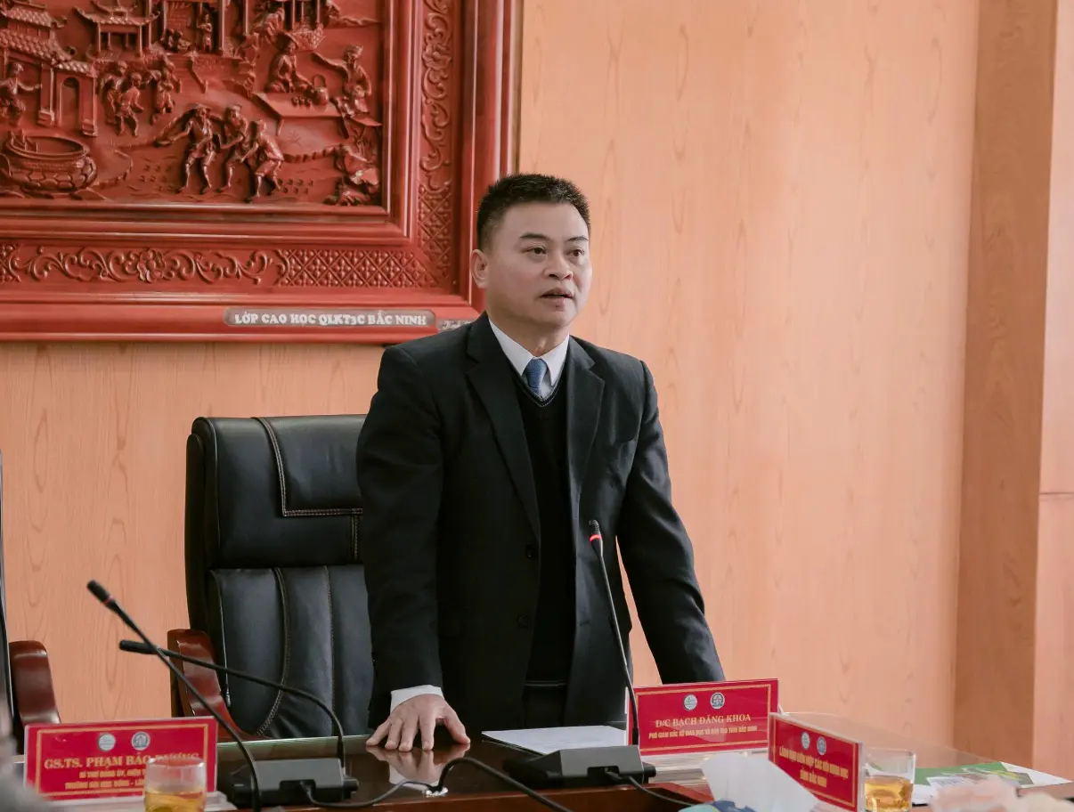 Ông Bạch Đăng Khoa – Phó Giám đốc Sở Giáo dục và Đào tạo tỉnh Bắc Ninh phát biểu tại chương trình. Theo ông Bạch Đăng Khoa – Phó Giám đốc Sở Giáo dục và Đào tạo tỉnh Bắc Ninh, cuộc thi được triển khai như hoạt động mở đầu cho Chương trình “Khởi tạo tương lai với AI” giai đoạn 2026–2030. Chương trình được xây dựng trên cơ sở phối hợp giữa ngành giáo dục, các trường đại học, đội ngũ chuyên gia, nhà khoa học và doanh nghiệp, nhằm hình thành hệ sinh thái học tập - sáng tạo - ứng dụng gắn với yêu cầu phát triển của tỉnh. Ông cho rằng, học sinh, sinh viên với sự hiểu biết sản phẩm OCOP từ chính đời sống địa phương, có nhiều lợi thế trong việc kể câu chuyện sản phẩm một cách chân thực, giàu cảm xúc và có sức lan tỏa trên môi trường số.