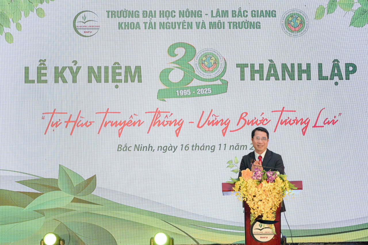 TS. Khương Mạnh Hà - Trưởng Khoa Tài nguyên & Môi trường phát biểu Phát biểu tại buổi lễ, TS. Khương Mạnh Hà - Trưởng Khoa Tài nguyên & Môi trường nhấn mạnh chặng đường 30 năm gắn liền với sự phát triển hơn 60 năm của Trường Đại học Nông - Lâm Bắc Giang. Khoa tiền thân là Khoa Địa chính thành lập năm 1995 tại Trường Trung học Kỹ thuật Nông nghiệp Trung ương, đổi tên thành Khoa Quản lý đất đai khi trường nâng cấp lên hệ cao đẳng năm 1999 và chính thức mang tên Khoa Tài nguyên & Môi trường từ năm 2011. Trải qua ba thập kỷ, Khoa đã đào tạo hàng chục nghìn kỹ sư, thạc sĩ, nhiều người đang giữ vị trí quan trọng trong cơ quan nhà nước, viện nghiên cứu và doanh nghiệp trên toàn quốc.