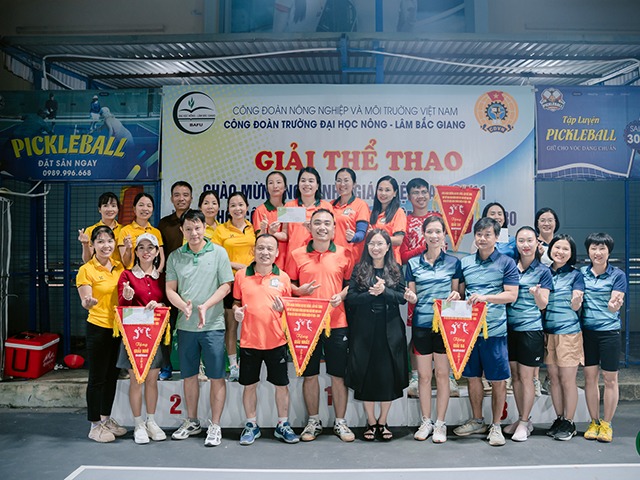Chiều ngày 28/11/2025, Công đoàn Trường Đại học Nông - Lâm Bắc Giang tổ chức Lễ bế mạc và trao giải Giải thể thao chào mừng Ngày Nhà giáo Việt Nam 20/11 và Đại hội Công đoàn Trường nhiệm kỳ 2025-2030. Tham dự có PGS.TS. Mai Thị Huyền - Phó Bí thư Đảng ủy, Phó Hiệu trưởng Nhà trường cùng đông đảo các vận động viên. Sau một tuần thi đấu, giải thể thao đã diễn ra sôi nổi với nhiều trận tranh tài ở các nội dung khác nhau. Năm nay, Công đoàn Trường THPT Thân Nhân Trung tiếp tục khẳng định phong độ vượt trội khi xuất sắc giành giải Nhất ở nhiều nội dung như bóng chuyền hơi nam nữ, chạy tiếp sức, kéo co và Pickleball đôi nam nữ. Ở nội dung bóng chuyền hơi nữ, liên quân Công đoàn Khoa Kinh tế - Tài chính, Phòng Quản trị Đầu tư và Phòng Tài chính - Kế toán đã tạo nên bất ngờ lớn. Với lối chơi khoa học, tinh thần thi đấu kiên cường và sự phối hợp ăn ý, các vận động viên nữ đã vượt qua nhiều đối thủ mạnh để giành chức vô địch đầy thuyết phục. Tại nội dung Pickleball đôi nam, đội Trung tâm Ngoại ngữ -Tin học tiếp tục thể hiện sự ổn định khi cặp vận động viên Thành - Kiên thi đấu tự tin, bản lĩnh và đầy tập trung. Với những pha bóng chuẩn xác và chiến thuật hợp lý, đôi vận động viên đã xuất sắc giành giải Nhất. Không chỉ có các vận động viên thi đấu xuất sắc trên sân, lực lượng cổ động viên đến từ các đơn vị cũng góp phần quan trọng tạo nên thành công của giải. Những tiếng cổ vũ, reo hò, vỗ tay không ngớt, cùng sự chuẩn bị chu đáo từ nước uống, đồ ăn nhẹ cho các đội thi đã tiếp thêm sức mạnh tinh thần cho các vận động viên. Đặc biệt, các công đoàn bộ phận như Trung tâm Ngoại ngữ, Tin học, Phòng Đào tạo, hay Khoa Kinh tế - Tài chính... luôn xuất hiện với lực lượng cổ vũ đông đảo, nhiệt huyết, giúp không khí thi đấu càng thêm sôi động và giàu cảm hứng. Đồng chí Phạm Văn Vân - Trưởng Ban Tổ chức giải thể thao cho biết: Với gần 200 vận động viên tham dự, giải thể thao năm nay được tổ chức chuyên nghiệp, bài bản, tạo sức lan tỏa mạnh mẽ trong cán bộ, viên chức. Hoạt động góp phần nâng cao sức khỏe, đời sống tinh thần và tăng cường sự gắn kết giữa các đơn vị trong Nhà trường. + Một số hình ảnh tại Lễ trao giải thể thao: